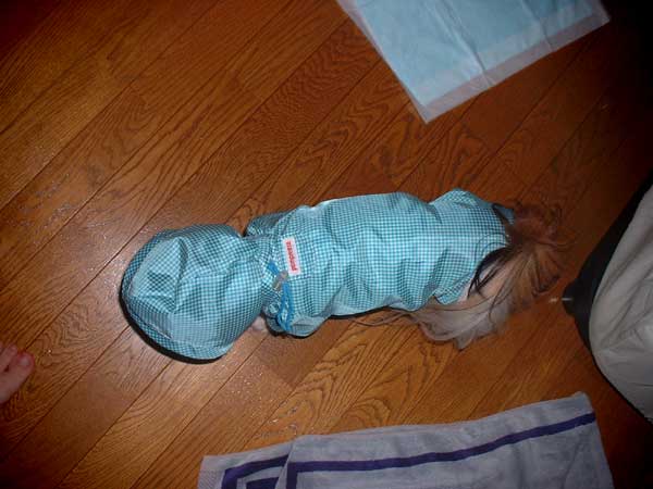 | 雨の日でも、うんちとおしっこだけは外でしたいはにぽん。 そして、いちど外に出てしまうと、時間がたつのを忘れて遠出になってしまうのです。 びしょぬれになってしまうとなにかと大変。 そこで、ある雨の日に、かっぱを買って着せてみました。 歩いてお店に行き、買って帰ってきせてみたらぶかぶかだったので、取り替えてもらいに 再度お店に行きました。今度は、はにぽんをだっこして行って、試着させてもらいました。 これでぬれなくてすむとほっとしたが、気がつくと私がびしょぬれでした。 |